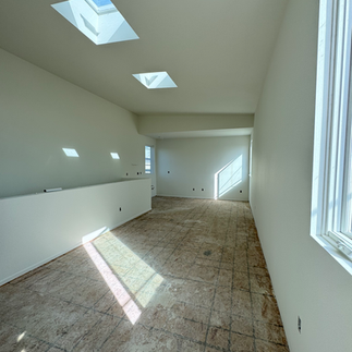 As the project moved from exposed studs to drywall, the architecture came into focus: tall ceilings, clean planes, and light cascading from above that makes the small footprint feel generous. The shift from construction to enclosure underscores what we love about ADUs—how an efficient form can hold a surprising amount of space, transforming a former shed into a bright, fully realized home tucked into a backyard.